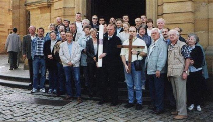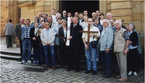 Besucher:Am 13. Oktober 2001 starteten 36 Personen zu einer Wallfahrt nachVierzehnheiligen, dem bekannten bayerischen Wallfahrtsort in der Nähe vonLichtenfels und Coburg. Nach einer Fahrt durch Niederbayern begleitete uns abRegensburg die Herbstsonne und bescherte uns einen wunderschönen Reisetag.In der Nähe von Schwandorf stieg unser Gemeindereferent Hurzlmeier noch zuuns in den Bus, den er organisierte die Programmpunkte der Wallfahrt inVierzehnheiligen.Gegen 11 Uhr kamen wir an der Wallfahrtskirche mit ihren zwei Türmen inVierzehnheiligen an. Gegenüber dieser bekannten Kirche steht auf der anderenSeite des Mains das Kloster Banz, bekannt auch von Klausurtagungen der Politik.Bei der Kirche begrüßte uns Gehörlosenseelsorgereferent Albin Zeck ausBamberg. Er führte uns durch die Basilika, welche in den Jahren 1743 bis 1772von Balthasar Neumann kunstvoll erbaut wurde. Der Baustil istSpätbarock/Rokoko. In dieser hellen, freundlichen Kirche stehen die Figuren der14 Nothelfer-Heiligen im Kreis. Mittelpunkt ist hoch über dem Altar dasChristuskind. In einer Seitenkapelle stellten wir unsere 1-Meter hohe Pilgerkerzezu Ehren der Vierzehn-Nothelfer auf. Nach der Führung durch die Basilika feiertenwir in der Kapelle des Bildungshauses "Frankenthal" einen Gottesdienst. Jederschrieb eine Bitte auf einen Zettel, worauf er die Nothelfer um Hilfe bat. DieseZettel hefteten wir an ein Kreuz.Nach dem Gottesdienst und einem guten Mittagessen furhen wir zum nahenStaffelberg (539 m h) wo einige wanderten und andere eine Kaffeepause machtenund den herrlichen Rundblick auf das Maintal, das Kloster Banz und die Höhendes Frankenwaldes geniesen konnten. Um 17 Uhr starteten wir zu unsererHeimfahrt, welche uns über Nürnberg und Regensburg zurück nach Landshutführte.Besonderer Dank gebührt hier Herrn Hurzlmeier für die Organisation vor Ort inVierzehnheiligen und Frau Brigitte Ringlstetter sowie Gottfried Paulus für dieVorbereitung und Mithilfe bei dieser allseits gelungenen Wallfahrt.Klicken Sie auf die Bilder, um sie zu vergrössern !